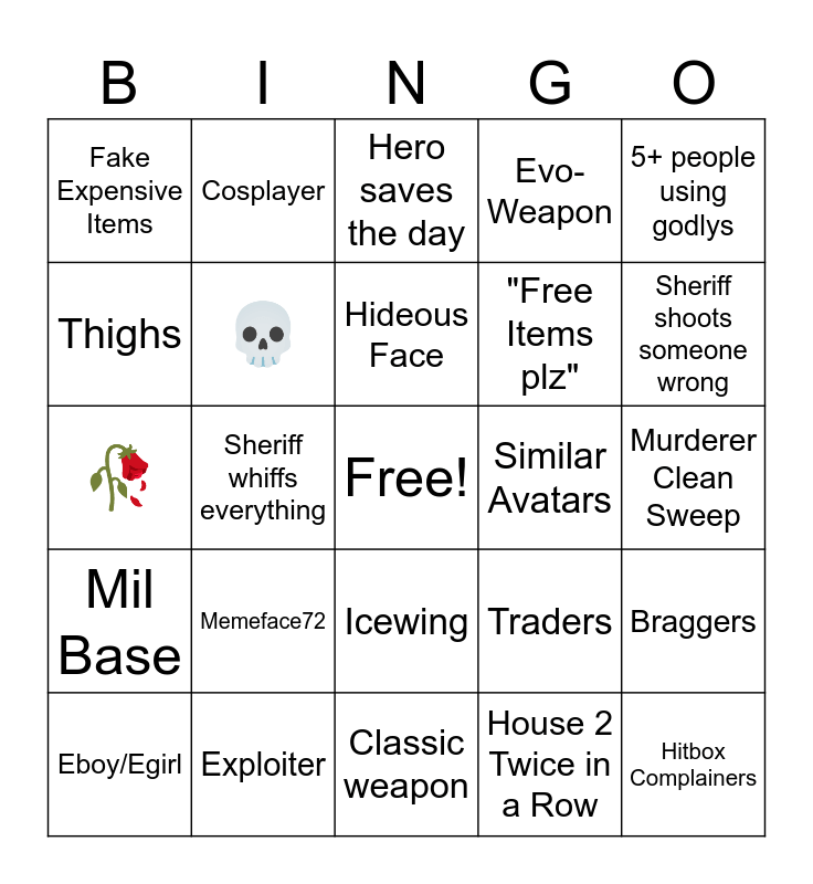 This bingo card has a free space and 24 words: Memeface72, Exploiter, Hideous Face, Eboy/Egirl, 5+ people using godlys, Fake Expensive Items, Thighs, Cosplayer, Similar Avatars, Icewing, "Free Items plz", 🥀, Traders, Braggers, 💀, House 2 Twice in a Row, Murderer Clean Sweep, Hero saves the day, Sheriff shoots someone wrong, Sheriff whiffs everything, Hitbox Complainers, Mil Base, Evo-Weapon and Classic weapon.