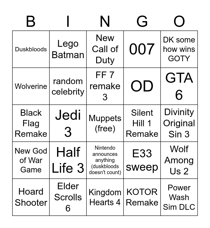 This bingo card has a free space and 24 words: Half Life 3, Elder Scrolls 6, FF 7 remake 3, Hoard Shooter, DK some how wins GOTY, Duskbloods, Wolverine, Lego Batman, Silent Hill 1 Remake, Nintendo announces anything (duskbloods doesn't count), OD, Black Flag Remake, E33 sweep, Wolf Among Us 2, random celebrity, KOTOR Remake, Divinity Original Sin 3, New Call of Duty, GTA 6, Jedi 3, Power Wash Sim DLC, New God of War Game, 007 and Kingdom Hearts 4.