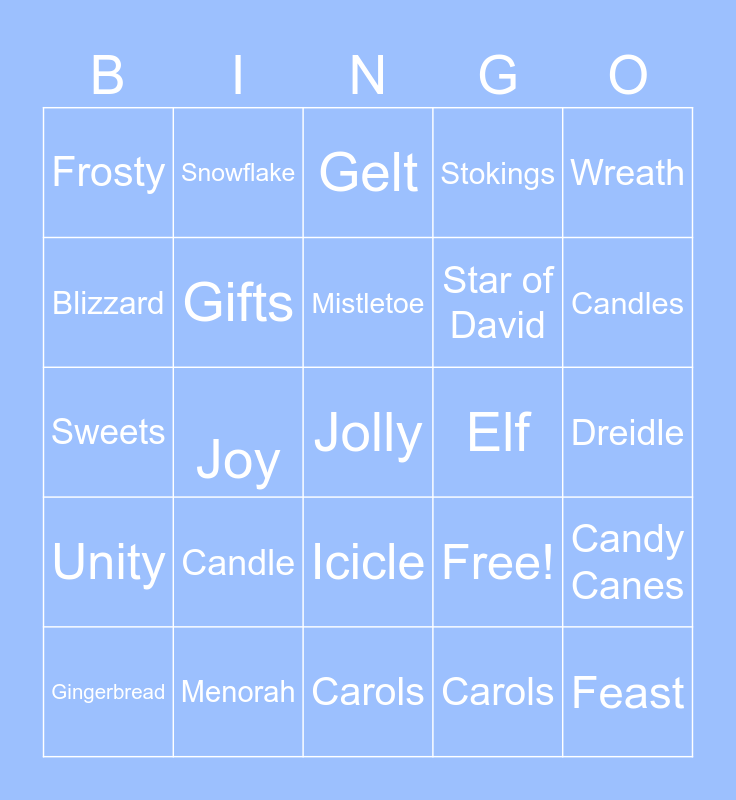 This bingo card has 25 words: Candle, Carols, Mistletoe, Gingerbread, Wreath, Frosty, Blizzard, Snowflake, Elf, Icicle, Star of David, Sweets, Free!, Candy Canes, Gifts, Feast, Dreidle, Gelt, Candles, Joy, Jolly, Menorah, Unity, Stokings and Carols.