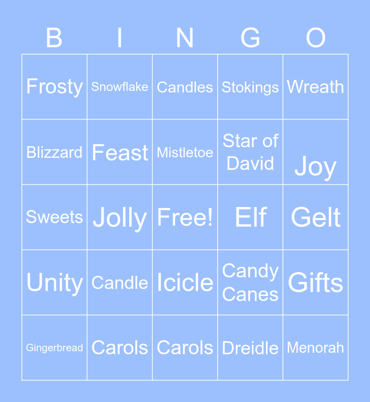This bingo card has a free space and 24 words: Candle, Carols, Mistletoe, Gingerbread, Wreath, Frosty, Blizzard, Snowflake, Elf, Icicle, Star of David, Sweets, Candy Canes, Gifts, Feast, Dreidle, Gelt, Candles, Joy, Jolly, Menorah, Unity, Stokings and Carols.