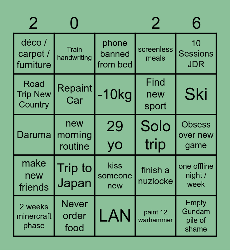 This bingo card has a free space and 24 words: Trip to Japan, Never order food, -10kg, 2 weeks minercraft phase, 10 Sessions JDR, déco / carpet / furniture, Road Trip New Country, Train handwriting, Solo trip, kiss someone new, Find new sport, Daruma, finish a nuzlocke, one offline night / week, Repaint Car, paint 12 warhammer, Obsess over new game, phone banned from bed, Ski, new morning routine, Empty Gundam pile of shame, make new friends, screenless meals and LAN.