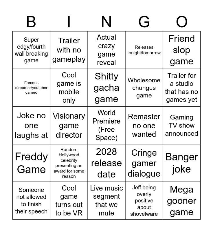This bingo card has a free space and 24 words: Random Hollywood celebrity presenting an award for some reason, Cool game turns out to be VR, Shitty gacha game, Someone not allowed to finish their speech, Friend slop game, Super edgy/fourth wall breaking game, Famous streamer/youtuber cameo, Trailer with no gameplay, Remaster no one wanted, 2028 release date, Wholesome chungus game, Joke no one laughs at, Cringe gamer dialogue, Banger joke, Cool game is mobile only, Jeff being overly positive about shovelware, Gaming TV show announced, Actual crazy game reveal, Trailer for a studio that has no games yet, Visionary game director, Mega gooner game, Freddy Game, Releases tonight/tomorrow and Live music segment that we mute.