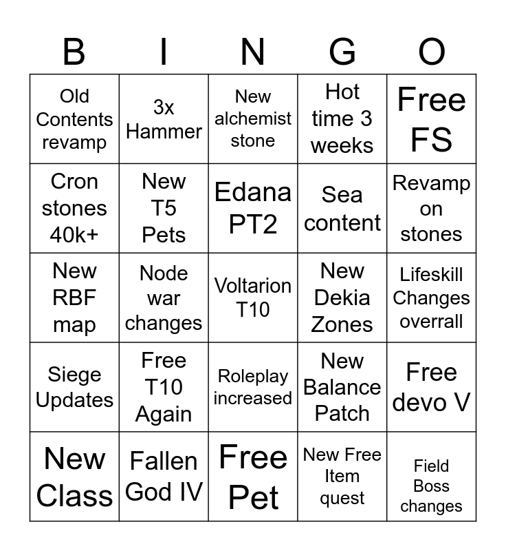 This bingo card has a free space and 24 words: Free T10 Again, Fallen God IV, Edana PT2, New Class, Free FS, Old Contents revamp, Cron stones 40k+, 3x Hammer, New Dekia Zones, Roleplay increased, Sea content, New RBF map, New Balance Patch, Free devo V, New T5 Pets, New Free Item quest, Lifeskill Changes overrall, New alchemist stone, Revamp on stones, Node war changes, Field Boss changes, Siege Updates, Hot time 3 weeks and Free Pet.