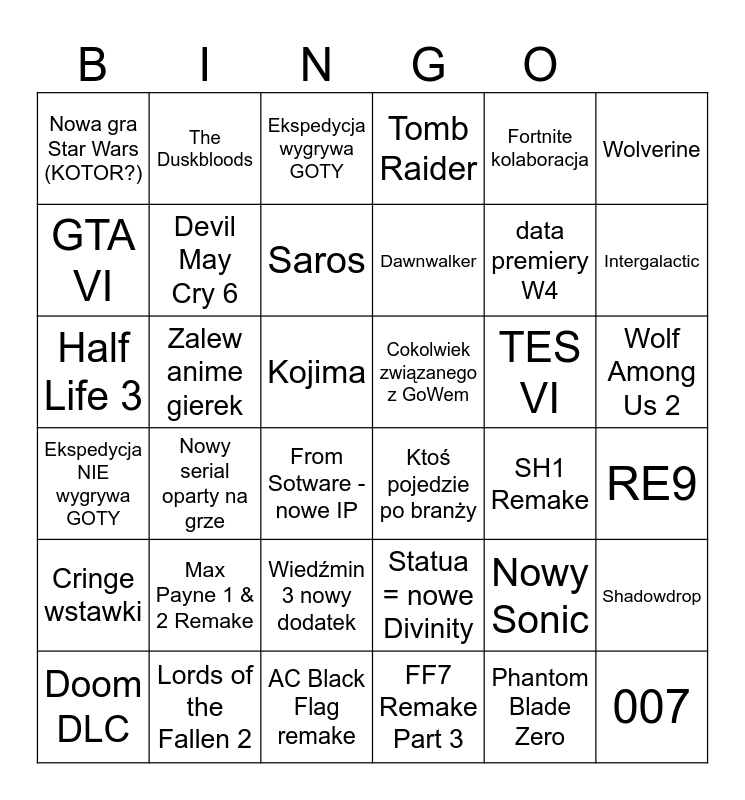 This bingo card has 36 words: Statua = nowe Divinity, Wiedźmin 3 nowy dodatek, FF7 Remake Part 3, GTA VI, Ekspedycja NIE wygrywa GOTY, Cokolwiek związanego z GoWem, Devil May Cry 6, AC Black Flag remake, Fortnite kolaboracja, Nowy Sonic, Intergalactic, Tomb Raider, Shadowdrop, Zalew anime gierek, Dawnwalker, Nowa gra Star Wars (KOTOR?), Cringe wstawki, TES VI, Half Life 3, Ekspedycja wygrywa GOTY, Kojima, Nowy serial oparty na grze, Ktoś pojedzie po branży, From Sotware - nowe IP, SH1 Remake, The Duskbloods, data premiery W4, Lords of the Fallen 2, Saros, Wolverine, 007, Doom DLC, RE9, Wolf Among Us 2, Max Payne 1 & 2 Remake and Phantom Blade Zero.
