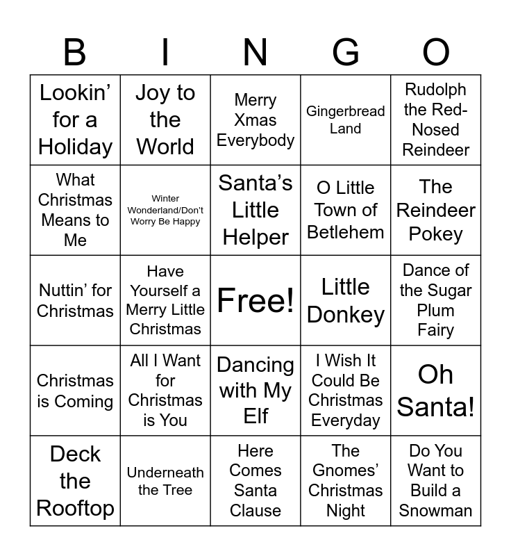 This bingo card has a free space and 104 words: Jingle Bells, Santa Claus is Coming to Town, Rudolph the Red-Nosed Reindeer, I Want a Hippopotamus for Christmas, Frosty the Snowman, Deck The Halls, The Chipmunk Song, Sleigh Ride, 12 Days of Christmas, You’re a Mean One, Mr. Grinch, We Wish You a Merry Christmas, Jingle Bell Rock, I Saw Mommy Kissing Santa Claus, Rockin’ Around the Christmas Tree, Let It Snow! Let It Snow! Let It Snow!, Feliz Navidad, Merry Xmas Everybody, Rudolph, the Red-Nosed Reindeer, The Silly Song, Up on the Housetop, Macarena Christmas, Santa Claus Is Comin’ to Town, Merry Christmas, Winter Wonderland, Dominick the Donkey, All I Want for Christmas is You, The Reindeer Pokey, Gingerbread Land, Ten Little Elves, Last Christmas, I Wish It Could Be Christmas Everyday, The Gnomes’ Christmas Night, Old St. Nicholas Had a Tree, Santa Tell Me, Merry Christmas Everyone, Little Saint Nick, All I want for Christmas (Is My Two Front Teeth), Five Gingerbread Men, Santa’s Little Helper, Underneath the Tree, Must Be Santa, Christmas is Coming, Snowman, What Christmas Means to Me, You Make It Feel Like Christmas, Lookin’ for a Holiday, Carol of the Bells, Do You Want to Build a Snowman, Happy Xmas (War Is Over), It’s Beginning to Look a Lot Like Christmas, My Only Wish (This Year), A Holly Jolly Christmas, On Christmas Night, It’s the Most Wonderful Time of the Year, When Santa Got Stuck Up the Chimney, Mary’s Boy Child, Little Drummer Boy, Christmas Pudding, Silent Night, Dancing with My Elf, Dance of the Sugar Plum Fairy, O Christmas Tree, Ding Dong Merrily on High, Five Little Candy Canes, Wonderful Christmastime, When You Wish Upon a Star, Sugarbaker Man, Joy to the World, Nuttin’ for Christmas, Have Yourself a Merry Little Christmas, Here Comes Santa Clause, Christmas (Baby Please Come Home), Suzy Snowflake, Merry Christmas, Happy Holidays, Where is Santa, Perfect Christmas Tree, A Marshmallow World, Deck the Rooftop, Mr. Santa, Together This Christmas, Over the River and Through the Woods, Oh Holy Night, Winter Wonderland/Don’t Worry Be Happy, The First Noel, Little Donkey, White Christmas, God Rest Ye Merry Gentlemen, Christmas Is A-Comin’ (May God Bless You), Gingerbread Man, In a House at the Forest Edge, I Told Santa, O Holy Night, Mistletoe, Oh Santa!, Together Now, 10 Little Elves, Do They Know It's Christmas?, O Little Town of Betlehem, Away in a Manger, Silver Bells, My Favourite Things, Love Me Like You (Christmas Mix), Jolly Xmas and Santa Bring My Baby Back (To Me).