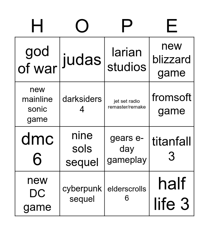 This bingo card has 16 words: cyberpunk sequel, titanfall 3, larian studios, god of war, dmc 6, judas, gears e-day gameplay, elderscrolls 6, new mainline sonic game, darksiders 4, new DC game, new blizzard game, nine sols sequel, fromsoft game, jet set radio remaster/remake and half life 3.