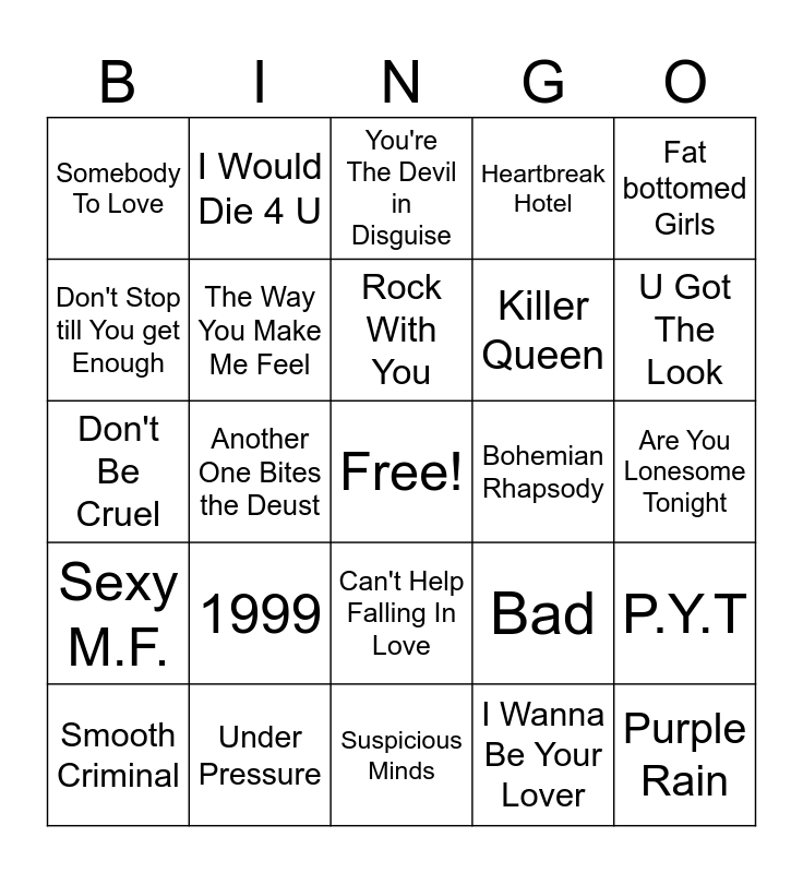 This bingo card has a free space and 53 words: Raspberry Beret, Purple Rain, Kiss, I Wanna Be Your Lover, 1999, Little Red Corvette, I Would Die 4 U, Billie Jean, Don't Stop till You get Enough, Thriller, The Way You Make Me Feel, Beat It, P.Y.T, Bad, Man in the Mirror, Smooth Criminal, Rock With You, Bohemian Rhapsody, We Will Rock You, Fat bottomed Girls, Another One Bites the Deust, Don't stop me now, Killer Queen, Somebody To Love, I Want To Break Free, Under Pressure, Bicycle Race, We Are The Champions, Erotic City, U Got The Look, Sign 'o' The Times, Radio Ga Ga, You're My Best Friend, Ay-OH, WANNA BE STARTING SOMETHING, Human Nature, Heartbreak Hotel, Suspicious Minds, You're The Devil in Disguise, Blue Suede Shoes, Jailhouse Rock, It's Now or Never, Are You Lonesome Tonight, Return To Sender, In The Ghetto, Can't Help Falling In Love, Let me be your teddy bear, All Shook Up, Don't Be Cruel, Sexy M.F., Pop Life, Crazy Little Thing Called Love and Dragon attack.