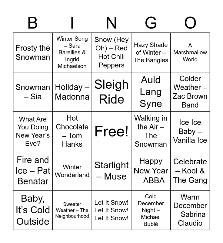 This bingo card has a free space and 25 words: Winter Wonderland, Let It Snow! Let It Snow! Let It Snow!, Sleigh Ride, Baby, It’s Cold Outside, A Marshmallow World, Frosty the Snowman, Snowman – Sia, Winter Song – Sara Bareilles & Ingrid Michaelson, Walking in the Air – The Snowman, Starlight – Muse, Auld Lang Syne, What Are You Doing New Year’s Eve?, Happy New Year – ABBA, Celebrate – Kool & The Gang, Holiday – Madonna, Cold as Ice – Foreigner, Ice Ice Baby – Vanilla Ice, Snow (Hey Oh) – Red Hot Chili Peppers, Colder Weather – Zac Brown Band, Hot Chocolate – Tom Hanks, Warm December – Sabrina Claudio, Sweater Weather – The Neighbourhood, Fire and Ice – Pat Benatar, Hazy Shade of Winter – The Bangles and Cold December Night – Michael Bublé.
