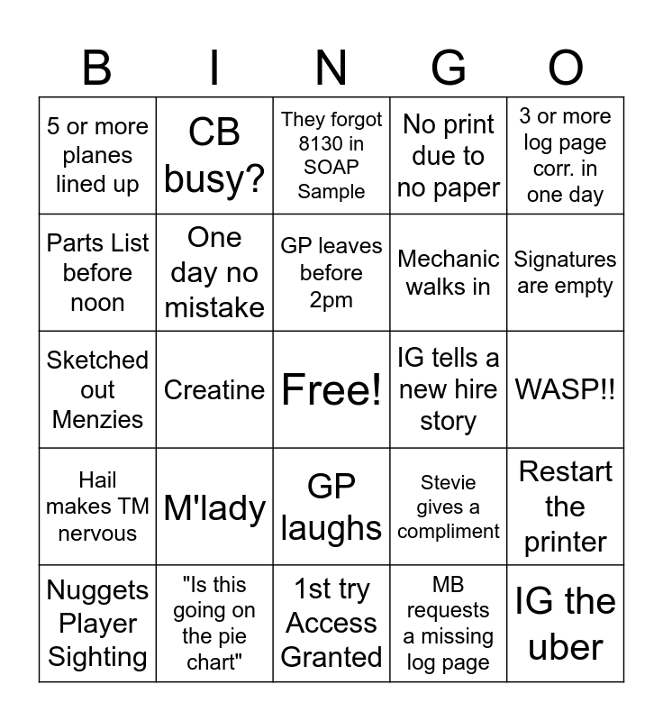 This bingo card has a free space and 24 words: M'lady, "Is this going on the pie chart", GP leaves before 2pm, Nuggets Player Sighting, 3 or more log page corr. in one day, 5 or more planes lined up, Parts List before noon, CB busy?, IG tells a new hire story, GP laughs, Mechanic walks in, Sketched out Menzies, Stevie gives a compliment, Restart the printer, One day no mistake, MB requests a missing log page, WASP!!, They forgot 8130 in SOAP Sample, Signatures are empty, Creatine, IG the uber, Hail makes TM nervous, No print due to no paper and 1st try Access Granted.