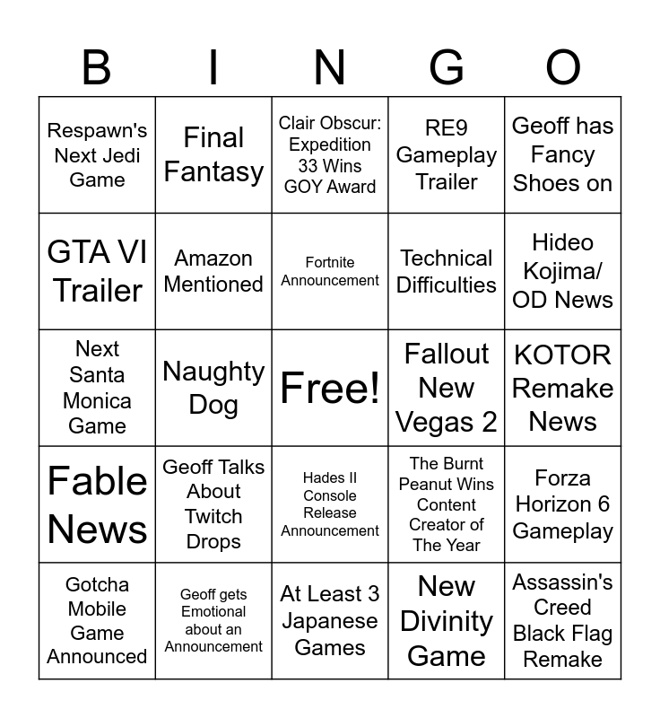 This bingo card has a free space and 24 words: Gotcha Mobile Game Announced, Geoff Talks About Twitch Drops, Fortnite Announcement, New Divinity Game, Geoff has Fancy Shoes on, Respawn's Next Jedi Game, Final Fantasy, Clair Obscur: Expedition 33 Wins GOY Award, Fallout New Vegas 2, KOTOR Remake News, Next Santa Monica Game, Amazon Mentioned, The Burnt Peanut Wins Content Creator of The Year, Forza Horizon 6 Gameplay, GTA VI Trailer, Geoff gets Emotional about an Announcement, At Least 3 Japanese Games, RE9 Gameplay Trailer, Hideo Kojima/ OD News, Fable News, Naughty Dog, Hades II Console Release Announcement, Technical Difficulties and Assassin's Creed Black Flag Remake.