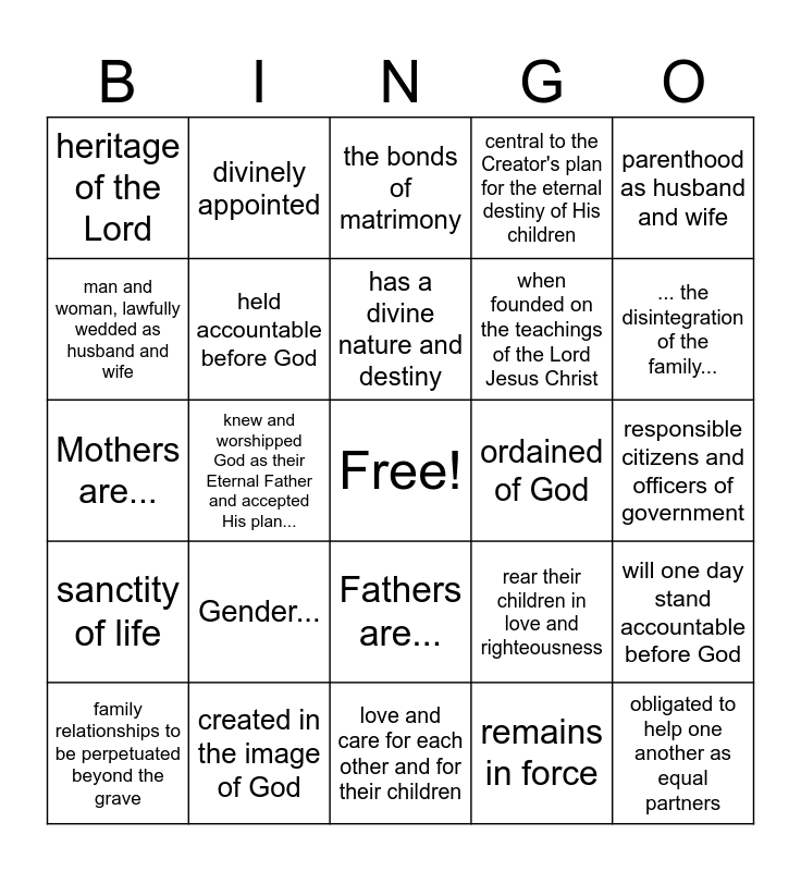 This bingo card has a free space and 24 words: Gender..., created in the image of God, has a divine nature and destiny, family relationships to be perpetuated beyond the grave, parenthood as husband and wife, heritage of the Lord, man and woman, lawfully wedded as husband and wife, divinely appointed, ordained of God, Fathers are..., when founded on the teachings of the Lord Jesus Christ, Mothers are..., rear their children in love and righteousness, will one day stand accountable before God, held accountable before God, remains in force, responsible citizens and officers of government, the bonds of matrimony, ... the disintegration of the family..., knew and worshipped God as their Eternal Father and accepted His plan..., obligated to help one another as equal partners, sanctity of life, central to the Creator's plan for the eternal destiny of His children and love and care for each other and for their children.