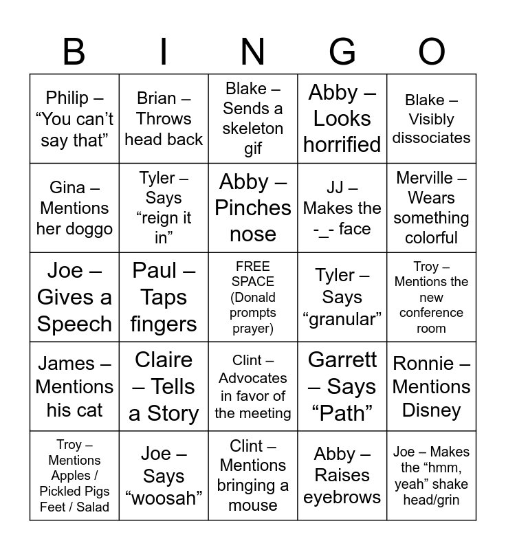 This bingo card has a free space and 24 words: Claire – Tells a Story, Joe – Says “woosah”, Abby – Pinches nose, Troy – Mentions Apples / Pickled Pigs Feet / Salad, Blake – Visibly dissociates, Philip – “You can’t say that”, Gina – Mentions her doggo, Brian – Throws head back, Tyler – Says “granular”, Clint – Advocates in favor of the meeting, JJ – Makes the -_- face, Joe – Gives a Speech, Garrett – Says “Path”, Ronnie – Mentions Disney, Tyler – Says “reign it in”, Abby – Raises eyebrows, Troy – Mentions the new conference room, Blake – Sends a skeleton gif, Merville – Wears something colorful, Paul – Taps fingers, Joe – Makes the “hmm, yeah” shake head/grin, James – Mentions his cat, Abby – Looks horrified and Clint – Mentions bringing a mouse.