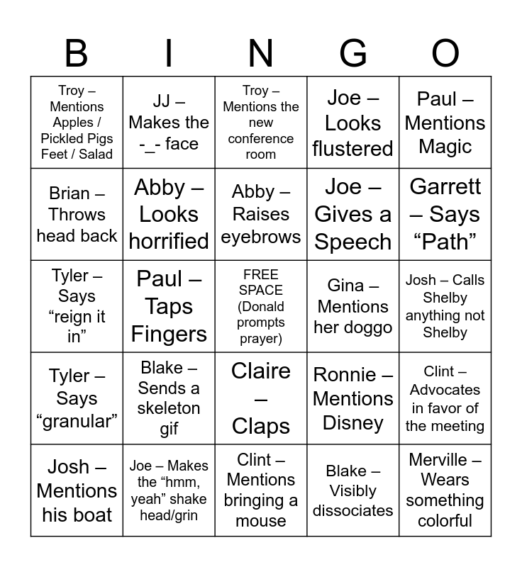 This bingo card has a free space and 24 words: Blake – Sends a skeleton gif, Joe – Makes the “hmm, yeah” shake head/grin, Abby – Raises eyebrows, Josh – Mentions his boat, Paul – Mentions Magic, Troy – Mentions Apples / Pickled Pigs Feet / Salad, Brian – Throws head back, JJ – Makes the -_- face, Gina – Mentions her doggo, Claire – Claps, Joe – Gives a Speech, Tyler – Says “reign it in”, Ronnie – Mentions Disney, Clint – Advocates in favor of the meeting, Abby – Looks horrified, Blake – Visibly dissociates, Josh – Calls Shelby anything not Shelby, Troy – Mentions the new conference room, Garrett – Says “Path”, Paul – Taps Fingers, Merville – Wears something colorful, Tyler – Says “granular”, Joe – Looks flustered and Clint – Mentions bringing a mouse.