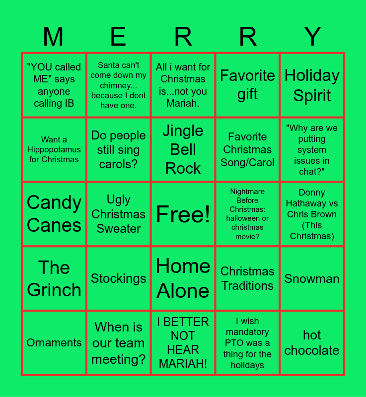 This bingo card has a free space and 49 words: Walking in a Bizzle Wonderland, hot chocolate, HEY Rudolph!, I BETTER NOT HEAR MARIAH!, Stockings, VTO for the holidays would be clutch, Santa can't come down my chimney... because I dont have one., Let it snow!, Want a Hippopotamus for Christmas, Please snow so I can launch a snowball attack, Do people still sing carols?, Favorite gift, Snowman, Christmas Traditions, New Year, New Me is around the corner, Christmas Lights, Jingle Bell Rock, Nightmare Before Christmas: halloween or christmas movie?, Blitzen Boogie, Holiday Spirit, Ugly Christmas Sweater, I wish mandatory PTO was a thing for the holidays, "YOU called ME" says anyone calling IB, Favorite Christmas Song/Carol, CS people have an ATTITUDE sometimes, "Why are we putting system issues in chat?", Ornaments, December, Home Alone, The Grinch, What did yall get me for Christmas?, What do yall want for Christmas?, Pay a bill for me for the holidays, I miss Christmas Vacation in school, When is our team meeting?, Feliz Navidad, Silent Night, Zoom Disconnected, Donny Hathaway vs Chris Brown (This Christmas), Favorite christmas movie, This cold is disrespectful!, R.I.P. Cyracom, Eggnog, Merry Christmas...from the Temptations, Candy Canes, All i want for Christmas is...not you Mariah., And a partridge in a pear tree, Christmas Tree and Do you wanna build a snow man?.