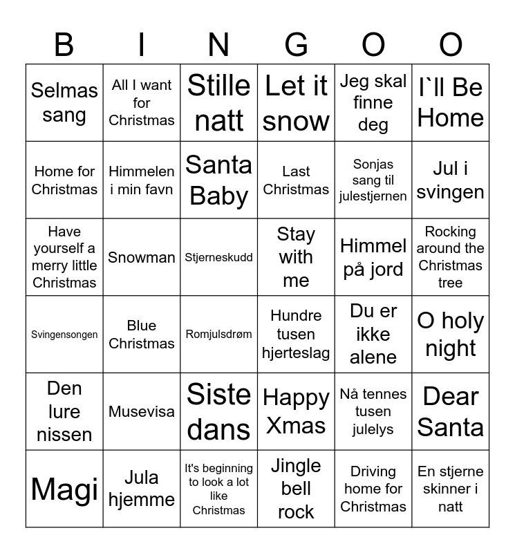 This bingo card has 42 words: Svingensongen, Snowman, Deilig er jorden, Let it snow, Himmel på jord, O holy night, Home for Christmas, Gje meg handa di venn, Stille natt, Last Christmas, Sonjas sang til julestjernen, Jul i svingen, Selmas sang, Himmelen i min favn, It's beginning to look a lot like Christmas, Stay with me, Driving home for Christmas, Rocking around the Christmas tree, Den lure nissen, All I want for Christmas, Santa Baby, Happy Xmas, Du er ikke alene, I`ll Be Home, Magi, Jula hjemme, Romjulsdrøm, Stjerneskudd, Nå tennes tusen julelys, En stjerne skinner i natt, Hey ho, Musevisa, Stjerneskudd, Hundre tusen hjerteslag, Felize navidad, Dear Santa, Have yourself a merry little Christmas, Blue Christmas, Siste dans, Jingle bell rock, Jeg skal finne deg and Halleluja.