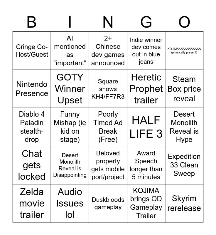 This bingo card has a free space and 24 words: Desert Monolith Reveal is Disappointing, Audio Issues lol, Square shows KH4/FF7R3, Zelda movie trailer, KOJIMAAAAAAAAAAAA (physically present), Cringe Co-Host/Guest, Nintendo Presence, AI mentioned as "important", HALF LIFE 3, Beloved property gets mobile port/project, Heretic Prophet trailer, Diablo 4 Paladin stealth-drop, Award Speech longer than 5 minutes, Expedition 33 Clean Sweep, GOTY Winner Upset, KOJIMA brings OD Gameplay Trailer, Desert Monolith Reveal is Hype, 2+ Chinese dev games announced, Steam Box price reveal, Funny Mishap (ie kid on stage), Skyrim rerelease, Chat gets locked, Indie winner dev comes out in blue jeans and Duskbloods gameplay.