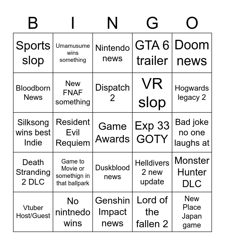 This bingo card has a free space and 24 words: Game to Movie or somethign in that ballpark, No nintnedo wins, Dispatch 2, Vtuber Host/Guest, Doom news, Sports slop, Bloodborn News, Umamusume wins something, Exp 33 GOTY, Duskblood news, VR slop, Silksong wins best Indie, Helldivers 2 new update, Monster Hunter DLC, New FNAF something, Lord of the fallen 2, Bad joke no one laughs at, Nintendo news, Hogwards legacy 2, Resident Evil Requiem, New Place Japan game, Death Stranding 2 DLC, GTA 6 trailer and Genshin Impact news.
