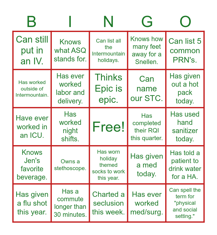 This bingo card has a free space and 29 words: Has given a flu shot this year., Has holiday decorations at work., Has worked night shifts., Has brought something to a potluck this month., Can still put in an IV., Can list all the Intermountain holidays., Has ever worked labor and delivery., Owns a stethoscope., Has completed their RQI this quarter., Has a commute longer than 30 minutes., Has used hand sanitizer today., Can spell the term for "physical and social setting.", Charted a seclusion this week., Has ever worked med/surg., Has given out a hot pack today., Has not completed their RQI this quarter., Has worn holiday themed socks to work this year., Knows Jen's favorite beverage., Can list 5 common PRN's., Have ever worked in an ICU., Has given a med today., Has been locked in a seclusion room., Can name our STC., Has worked outside of Intermountain., Knows how many feet away for a Snellen., Knows what ASQ stands for., Has told a patient to drink water for a HA., Thinks Epic is epic. and Has to wear a sweater with their scrubs..