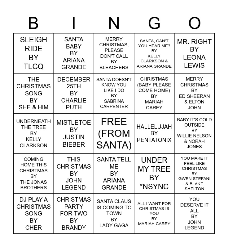 This bingo card has a free space and 26 words: SANTA TELL ME BY ARIANA GRANDE, ALL I WANT FOR CHRISTMAS IS YOU BY MARIAH CAREY, SANTA DOESN'T KNOW YOU LIKE I DO BY SABRINA CARPENTER, CHRISTMAS PARTY FOR TWO BY BRANDY, MR. RIGHT BY LEONA LEWIS, SLEIGH RIDE BY TLCQ, THE CHRISTMAS SONG BY SHE & HIM, SANTA BABY BY ARIANA GRANDE, BABY IT'S COLD OUTSIDE BY WILLIE NELSON & NORAH JONES, UNDER MY TREE BY *NSYNC, CHRISTMAS (BABY PLEASE COME HOME) BY MARIAH CAREY, UNDERNEATH THE TREE BY KELLY CLARKSON, YOU MAKE IT FEEL LIKE CHRISTMAS BY GWEN STEFANI & BLAKE SHELTON, DJ PLAY A CHRISTMAS SONG BY CHER, MISTLETOE BY JUSTIN BIEBER, MY ONLY WISH (THIS YEAR) BY BRITNEY SPEARS, SANTA, CAN'T YOU HEAR ME? BY KELLY CLARKSON & ARIANA GRANDE, COMING HOME THIS CHRISTMAS BY THE JONAS BROTHERS, MERRY CHRISTMAS, PLEASE DON'T CALL BY BLEACHERS, YOU DESERVE IT ALL BY JOHN LEGEND, MERRY CHRISTMAS BY ED SHEERAN & ELTON JOHN, SANTA CLAUS IS COMING TO TOWN BY LADY GAGA, HALLELUJAH BY PENTATONIX, THIS CHRISTMAS BY JOHN LEGEND, DECEMBER 25TH BY CHARLIE PUTH and MERRY CHRISTMAS, HAPPY HOLIDAYS BY *NSYNC.