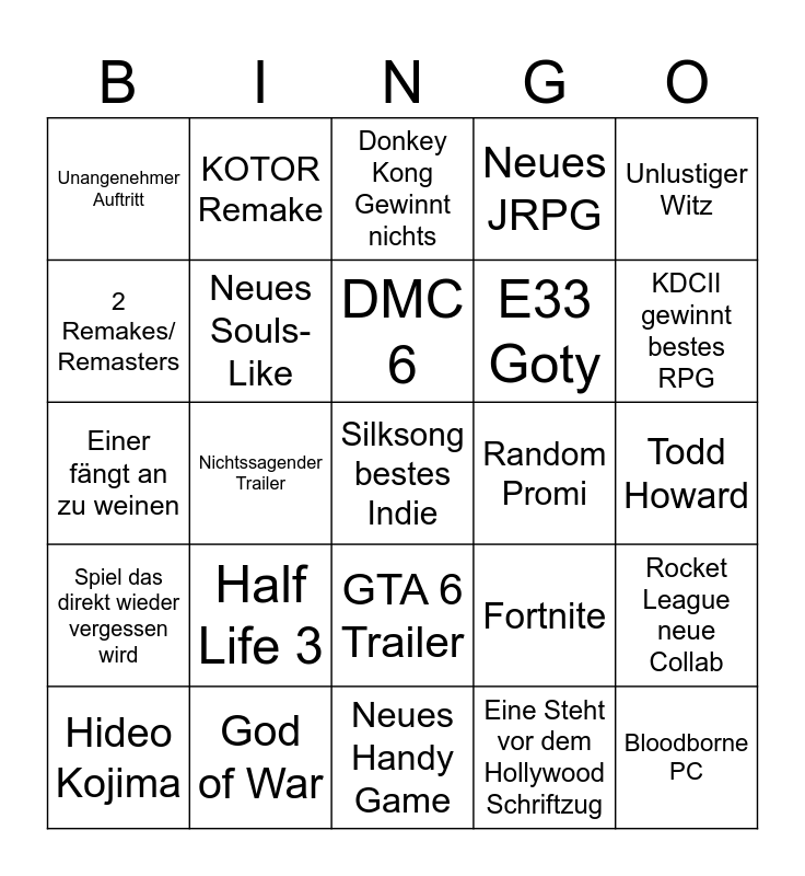 This bingo card has a free space and 24 words: Half Life 3, God of War, DMC 6, Hideo Kojima, Unlustiger Witz, Unangenehmer Auftritt, 2 Remakes/ Remasters, KOTOR Remake, Random Promi, GTA 6 Trailer, E33 Goty, Einer fängt an zu weinen, Fortnite, Rocket League neue Collab, Neues Souls-Like, Eine Steht vor dem Hollywood Schriftzug, Todd Howard, Donkey Kong Gewinnt nichts, KDCII gewinnt bestes RPG, Nichtssagender Trailer, Bloodborne PC, Spiel das direkt wieder vergessen wird, Neues JRPG and Neues Handy Game.