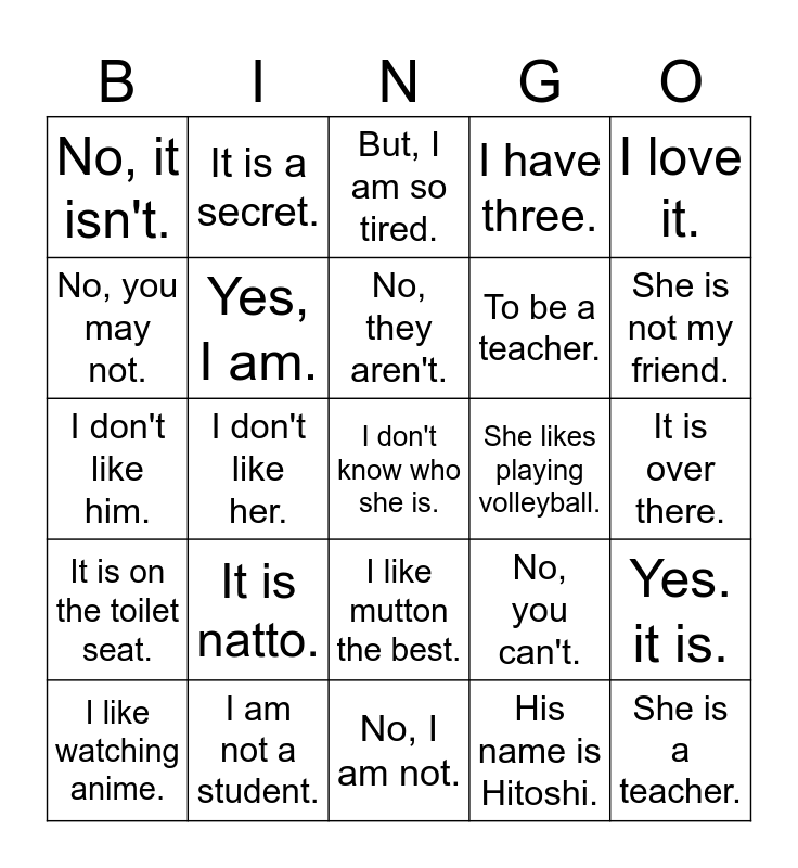 This bingo card has 177 words: Free!, By bus, To see my friends., In the Library., No, you can't., I'm happy to hear that., I have some., She is nice., He is not my friend., He is nice., Really?, Are you kidding!?, It is a secret., Don't say that., To be a teacher., You are really nice., It is in my house., I like them., I know him., I don't play it., No, I won't., Yes, I do., Yes, I will., I don't want it., I like to go shopping., No, I don't., You can see it in America., That is Doraemon., But, I am so tired., I don't have money., His name is Koji., He is not my friend., It is delicious., Don't say that., No way!!!, I don't know., I don't want to do that., It is in my pocket., I don't like them., She is my friend., I love it., No, I didn't., It is natto., I am interested in it., Yes, I did., He is really nice., I know her., I don't know him., I don't know her., He is Adeel Siraj., She is not my friend., By bus., Yes, I am., No, I am not., Yes, you are., No, you aren't., Yes, he is., No, he isn't., Yes, she is., No, she isn't., Yes. it is., No, it isn't., Yes, they are., No, they aren't., Yes, I do., No, I don't., Yes, he does., No, he doesn't., Yes, they do., No, they don't., Yes, I can., No, I can't., Yes, you can., No, you can't., I have one., I have none., I have some., I have never been there., I like it., I will go there soon., She is a teacher., I like to go camping., He lives in Akasaki., It's mine., He is from Pakistan., It is near Yonago station., Yes, I went there on Sunday., It is behind you., I don't have it., No, she doesn't., Yes, you may., No, you may not., I don't know who he is., I don't know who she is., Yes, I have., No, I haven't., It is in my car., It is in Koji's car., It is in Adeel's car., His name is Hitoshi., Her name is Yumiko., I don't like him., I don't like her., He is my friend., I don't like it., Oh, really?, I have never done it., I want to do that., Thank you., I like him., I like her., I love them., No, I didn't., No, he didn't., No, she didn't., It is over there., It is under the table., It is on the wall., It is over the mountain., It is between Tottori and Yonago., It is by the school., It is on the toilet seat., It is in heaven., It is inside your bag., I don't believe you., It is unbelievable., What!!?, I am fine, thanks., You look nice., That is nice., He lives in Kotoura Town., She lives in Yonago City., He is in the kendo club., She is in the Arts club., She can play the piano., She can play baseball., He likes to play basketball., She likes to watch movies., He likes playing baseball., She likes playing volleyball., Yes, I like sports., No, I don't like it., I am not a student., I am not a teacher., I am a teacher., I like you., I don't like you., Good!, That great!, That is wonderful., That is awesome., He is from the Netherlands., He is from the U.K., No, I don't speak Japanese., Yes, I can speak English., He speaks Japanglish., I like tea more than coffee., I like beef more than pork., I like mutton the best., I like doing BBQs., I like wine the best of all drinks., I love Daisen Okowa., I don't want to go there., I have two., I have three., I have four., I have ten., I have too many., I have not enough., I want more., I don't want more., I like watching anime., I like watching movies., I like listening to music., I like to go driving., I like to go snowboarding. and I like to go skiing..