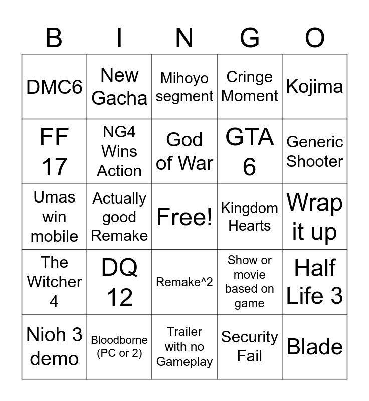 This bingo card has a free space and 24 words: DQ 12, Bloodborne (PC or 2), God of War, Nioh 3 demo, Kojima, DMC6, FF 17, New Gacha, Kingdom Hearts, Remake^2, GTA 6, Umas win mobile, Show or movie based on game, Half Life 3, NG4 Wins Action, Security Fail, Wrap it up, Mihoyo segment, Generic Shooter, Actually good Remake, Blade, The Witcher 4, Cringe Moment and Trailer with no Gameplay.