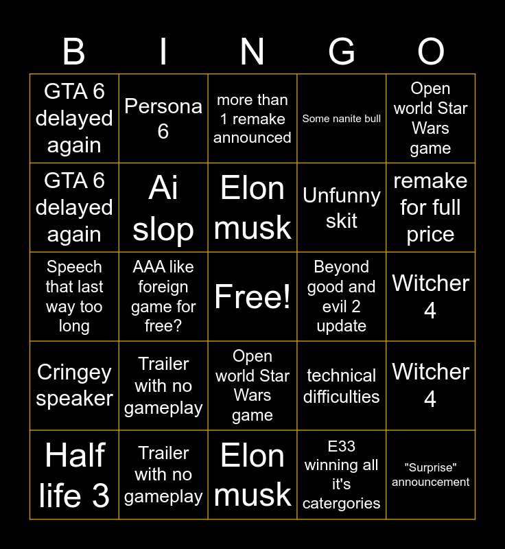 This bingo card has a free space and 49 words: Cringey speaker, Trailer with no gameplay, Trailer with gameplay, E33 winning all it's catergories, Witcher 4, Half life 3, Persona 6, Jet set radio, Unfunny skit, more than 1 extraction shooter announced, Speech that last way too long, Ai slop, technical difficulties, "Surprise" announcement, todd howard, Kojima, more than 1 remake announced, Beyond good and evil 2 update, remake for full price, GTA 6 delayed again, AAA like foreign game for free?, Elon musk, Some nanite bull, Open world Star Wars game, Open world Star Wars game, Cringey speaker, Trailer with no gameplay, Trailer with gameplay, E33 winning all it's catergories, Witcher 4, Half life 3, Persona 6, Jet set radio, Unfunny skit, more than 1 extraction shooter announced, Speech that last way too long, Ai slop, more than 1 remake announced, technical difficulties, "Surprise" announcement, todd howard, Kojima, Elon musk, Beyond good and evil 2 update, remake for full price, GTA 6 delayed again, AAA like foreign game for free?, Open world Star Wars game and Some nanite bull.