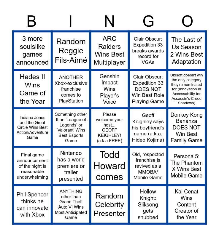 This bingo card has a free space and 24 words: Nintendo has a world premiere or trailer presented, ANYTHING other than Grand Theft Auto VI Wins Most Anticipated Game, Genshin Impact Wins Player's Voice, Phil Spencer thinks he can innovate with Xbox, The Last of Us Season 2 Wins Best Adaptation, 3 more soulslike games announced, Hades II Wins Game of the Year, Random Reggie Fils-Aimé, Geoff Keighley says his boyfriend's name (a.k.a. Hideo Kojima), Todd Howard comes, Clair Obscur: Expedition 33 DOES NOT Win Best Role Playing Game, Indiana Jones and the Great Circle Wins Best Action/Adventure Game, Old, respected franchise is revived as a MMOBA/ Mobile Game, Persona 5: The Phantom X Wins Best Mobile Game, ANOTHER Xbox-exclusive franchise comes to PlayStation, Hollow Knight: Sliksong gets snubbed, Donkey Kong Bananza DOES NOT Win Best Family Game, ARC Raiders Wins Best Multiplayer, Ubisoft doesn't win the only category they're nominated for (Innovation in Accessability for Assassin's Creed Shadows), Something other than 'League of Legends' or 'Valorant' Wins Best Esports Game, Kai Cenat Wins Content Creator of the Year, Final game announcement of the night is reasonable underwhelming, Clair Obscur: Expedition 33 breaks awards record for VGAs and Random Celebrity Presenter.