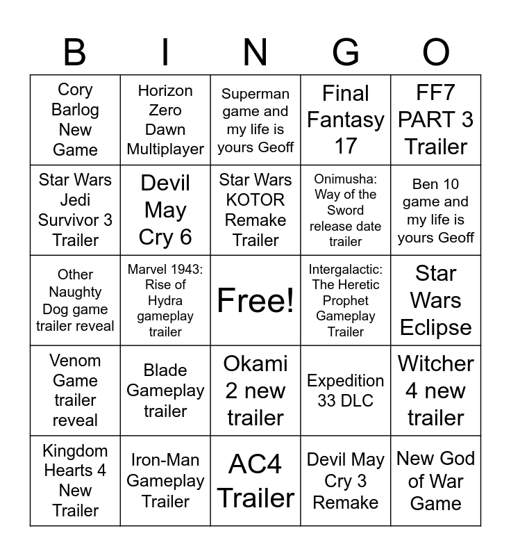 This bingo card has a free space and 24 words: Blade Gameplay trailer, Iron-Man Gameplay Trailer, Star Wars KOTOR Remake Trailer, Kingdom Hearts 4 New Trailer, FF7 PART 3 Trailer, Cory Barlog New Game, Star Wars Jedi Survivor 3 Trailer, Horizon Zero Dawn Multiplayer, Intergalactic: The Heretic Prophet Gameplay Trailer, Okami 2 new trailer, Onimusha: Way of the Sword release date trailer, Other Naughty Dog game trailer reveal, Expedition 33 DLC, Witcher 4 new trailer, Devil May Cry 6, Devil May Cry 3 Remake, Star Wars Eclipse, Superman game and my life is yours Geoff, Ben 10 game and my life is yours Geoff, Marvel 1943: Rise of Hydra gameplay trailer, New God of War Game, Venom Game trailer reveal, Final Fantasy 17 and AC4 Trailer.