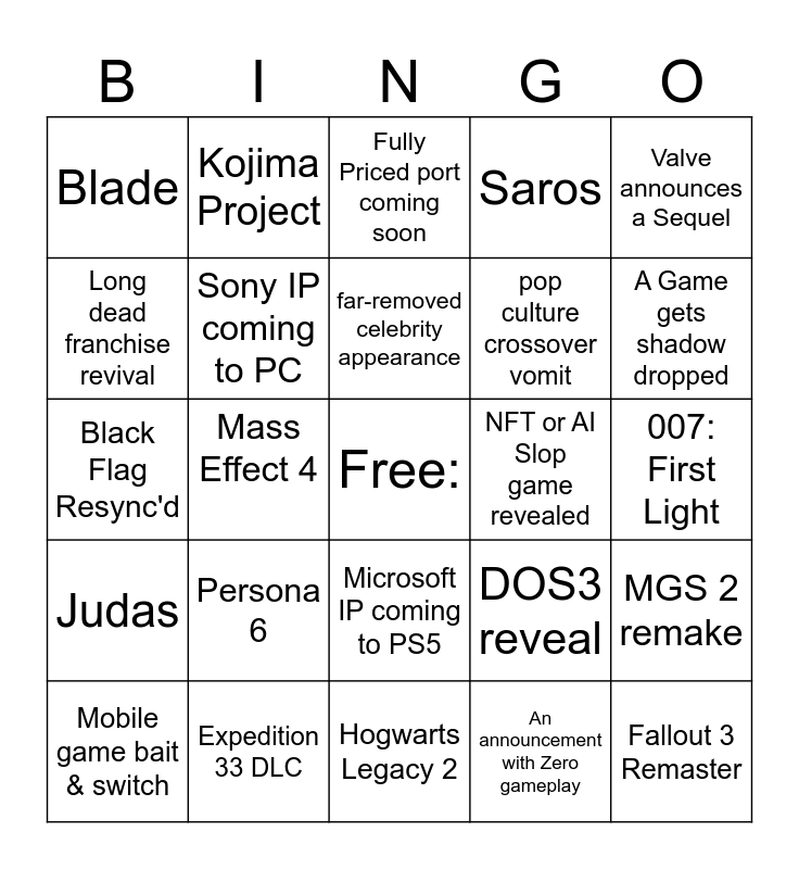 This bingo card has a free space and 24 words: Persona 6, Expedition 33 DLC, far-removed celebrity appearance, Mobile game bait & switch, Valve announces a Sequel, Blade, Long dead franchise revival, Kojima Project, NFT or AI Slop game revealed, Microsoft IP coming to PS5, pop culture crossover vomit, Black Flag Resync'd, DOS3 reveal, MGS 2 remake, Sony IP coming to PC, An announcement with Zero gameplay, 007: First Light, Fully Priced port coming soon, A Game gets shadow dropped, Mass Effect 4, Fallout 3 Remaster, Judas, Saros and Hogwarts Legacy 2.