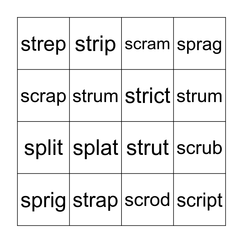 This bingo card has 16 words: strap, scrub, scram, strep, split, strip, strut, scrod, scrap, strum, sprig, sprag, splat, strum, strict and script.