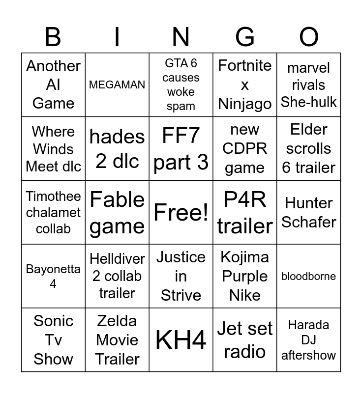 This bingo card has a free space and 24 words: Helldiver 2 collab trailer, Zelda Movie Trailer, FF7 part 3, Sonic Tv Show, marvel rivals She-hulk, Another AI Game, Where Winds Meet dlc, MEGAMAN, P4R trailer, Justice in Strive, new CDPR game, Timothee chalamet collab, Kojima Purple Nike, bloodborne, hades 2 dlc, Jet set radio, Hunter Schafer, GTA 6 causes woke spam, Elder scrolls 6 trailer, Fable game, Harada DJ aftershow, Bayonetta 4, Fortnite x Ninjago and KH4.