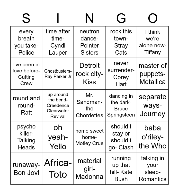 This bingo card has a free space and 49 words: white rabbit- Jefferson Airplane, talking in your sleep- Romantics, fernando- ABBA, material girl- Madonna, oh yeah- Yello, I melt with you- Modern English, time after time- Cyndi Lauper, R.O.C.K in the USA- John melloncamp, I've been in love before- Cutting Crew, rock and roll hoochie koo- Rick Derringer, Ghostbusters- Ray Parker Jr, rock this town- Stray Cats, baba o'riley- the Who, should i stay or should i go- Clash, fire and rain- James Taylor, rock me Amadeus- Falco, Detroit rock city- Kiss, dancing in the dark- Bruce Springsteen, hot blooded- Foreigner, I think we're alone now- Tiffany, up around the bend- Creedence Clearwater Revival, running up that hill- Kate Bush, every breath you take- Police, never surrender- Corey Hart, you don't mess around with Jim- Jim Croce, master of puppets- Metallica, runaway- Bon Jovi, total eclipse of the heart- Bonnie Tyler, home sweet home- Motley Crue, psycho killer- Talking Heads, moving in stereo- the Cars, my bologna- Weird Al Yankovic, another brick in the wall 2- Pink Floyd, wipe out- Surfaris, Africa- Toto, rockin Robin- Michael Jackson, whip it- Devo, upside down- Diana Ross, separate ways- Journey, you spin me right round- Dead or Alive, can't fight this feeling- REO speedwagon, here comes the rain again- Eurythmics, girls on film- Duran Duran, love is a battlefield- Pat Benatar, round and round-Ratt, neutron dance- Pointer Sisters, hazy shade of winter- Bangles, bicycle race- Queen and workin' for a livin'- Huey Lewis and the news.
