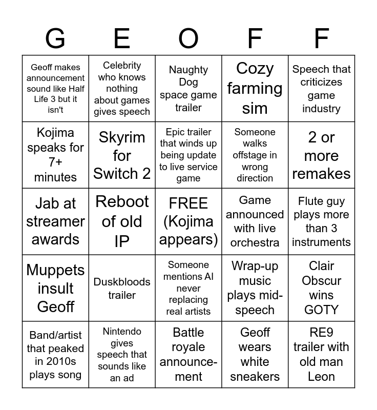 This bingo card has a free space and 24 words: Duskbloods trailer, Nintendo gives speech that sounds like an ad, Epic trailer that winds up being update to live service game, Band/artist that peaked in 2010s plays song, Speech that criticizes game industry, Geoff makes announcement sound like Half Life 3 but it isn't, Kojima speaks for 7+ minutes, Celebrity who knows nothing about games gives speech, Game announced with live orchestra, Someone mentions AI never replacing real artists, Someone walks offstage in wrong direction, Jab at streamer awards, Wrap-up music plays mid-speech, Clair Obscur wins GOTY, Skyrim for Switch 2, Geoff wears white sneakers, Flute guy plays more than 3 instruments, Naughty Dog space game trailer, 2 or more remakes, Reboot of old IP, RE9 trailer with old man Leon, Muppets insult Geoff, Cozy farming sim and Battle royale announce-ment.