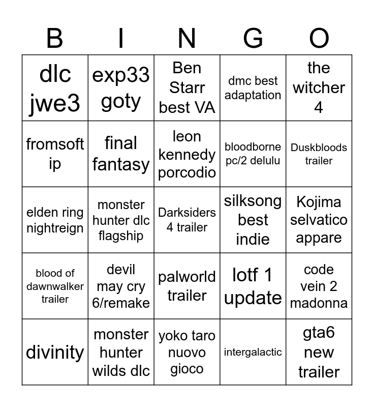 This bingo card has a free space and 24 words: devil may cry 6/remake, monster hunter wilds dlc, leon kennedy porcodio, divinity, the witcher 4, dlc jwe3, fromsoft ip, exp33 goty, silksong best indie, palworld trailer, bloodborne pc/2 delulu, elden ring nightreign, lotf 1 update, code vein 2 madonna, final fantasy, intergalactic, Kojima selvatico appare, Ben Starr best VA, Duskbloods trailer, monster hunter dlc flagship, gta6 new trailer, blood of dawnwalker trailer, dmc best adaptation and yoko taro nuovo gioco.
