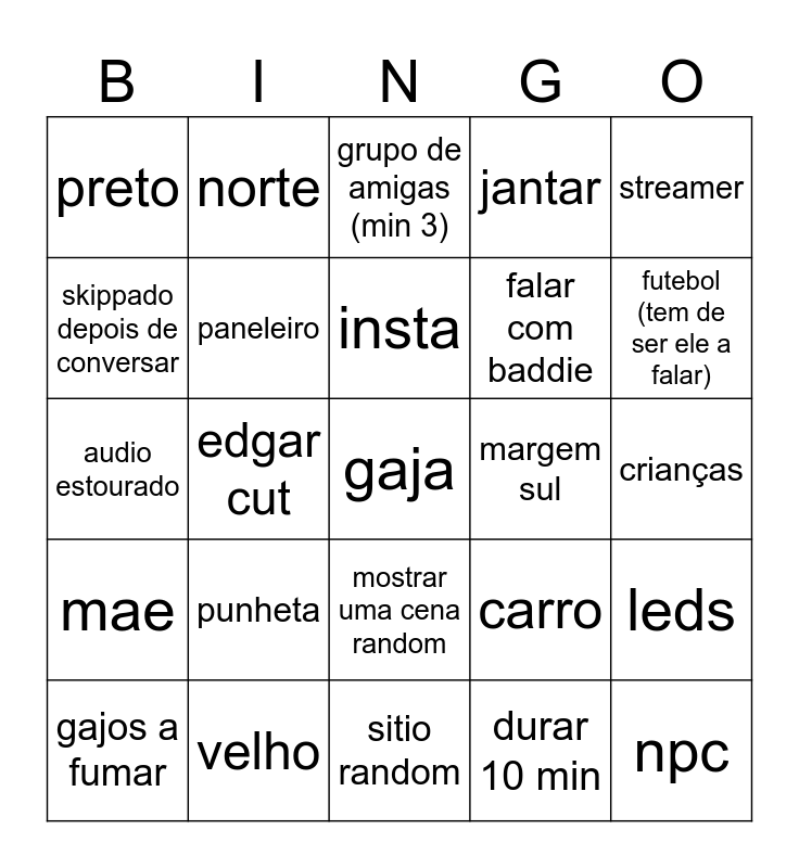 This bingo card has a free space and 24 words: punheta, velho, insta, gajos a fumar, streamer, preto, skippado depois de conversar, norte, margem sul, mostrar uma cena random, falar com baddie, audio estourado, carro, leds, paneleiro, durar 10 min, crianças, grupo de amigas (min 3), futebol (tem de ser ele a falar), edgar cut, npc, mae, jantar and sitio random.
