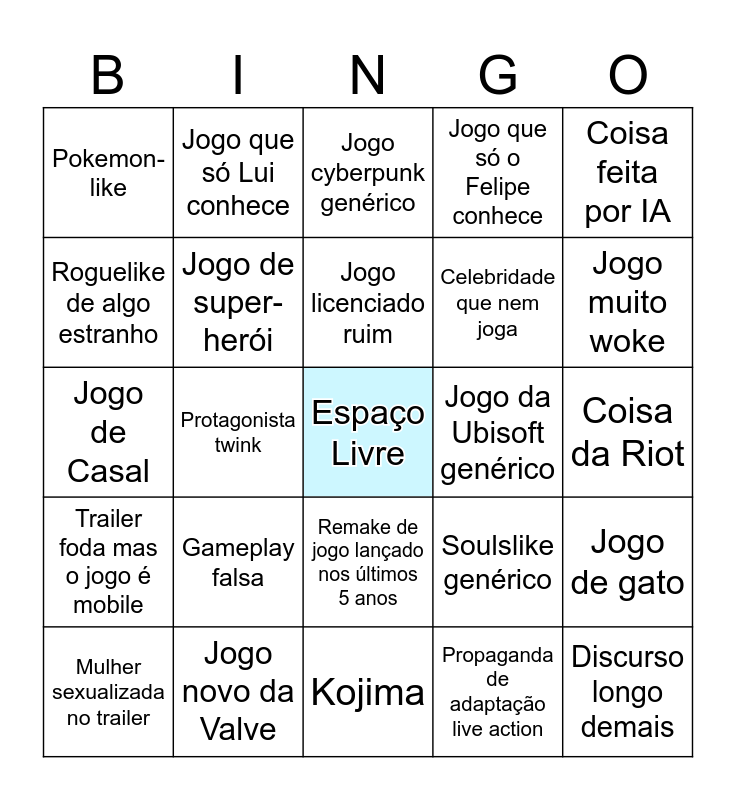 This bingo card has a free space and 54 words: Jogo de Georgia, Trailer foda mas o jogo é mobile, Collab de Fortnite, Final Fantasy (remake ou novo), Remake de jogo lançado nos últimos 5 anos, Expansão nova de jogo da Hoyo, Jogo que só o Felipe conhece, Piada cringe, Roguelike de algo estranho, MMO ruim, Pokemon-like, Georgia falar que um jogo é quadrado, Jogo novo da Valve, Mulher sexualizada no trailer, Jogo anime hack n slash, Kojima, Discurso longo demais, Celebridade que nem joga, O jogo brasileiro meme lá, Coisa da Riot, Soulslike genérico, Friendslop novo, Jogo da Ubisoft genérico, Coisa feita por IA, Alguém com roupa estranha, Jogo que só Lui conhece, Boomer shooter, Hollow-like, Laura Bailley ou Troy Baker, Propaganda de adaptação live action, Jogo mascot horror, Hytale, Jogo de esporte, Todd Howard, Jogo cyberpunk genérico, From software, Jogo de Casal, Jogo de gato, Games for impact bait, Jogo de super-herói, Jogo VR, Jogo de qualidade horrível, Streamer bait, Anime arena, Gameplay falsa, Extraction shooter, Jogo com diálogo da marvel, Geoff hypa o jogo e é uma bosta, Jogo licenciado ruim, Protagonista twink, Jogo muito woke, Jogo de culinária em grupo, Jogo russo genérico and Hero shooter.