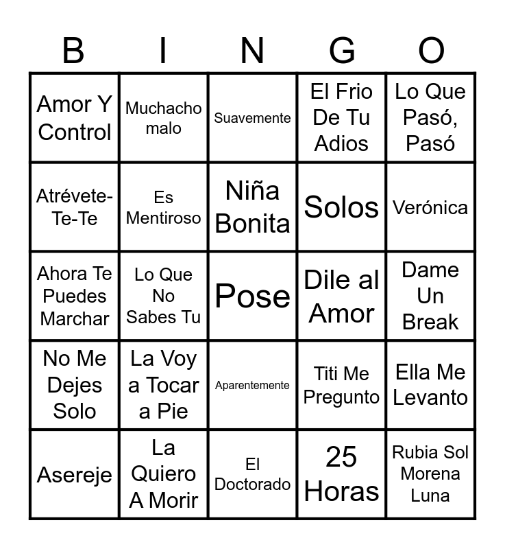 This bingo card has 74 words: Free!, Tiburon, Suavemente, Rosas, Ciega, Sordomuda, Suerte (Whenever, Whenever), De Musica Ligera, Colgando en tus manos, Asereje, Caraluna, Mi Primer Millon, Tu No Eres Para Mi, Niña Bonita, Atrévete-Te-Te, Andas En Mi Cabeza, Lo Que No Sabes Tu, Rubia Sol Morena Luna, Verónica, Tabaco y Chanel, Ahora Te Puedes Marchar, Es Mentiroso, Muchacho malo, El Frio De Tu Adios, Juana la Cubana, Pose, Llamado de Emergencia, Tu Príncipe, Ella Y Yo, Dile, Quiero Bailar, Lo Que Pasó, Pasó, Tu Angelito, Tu Eres Ajena, Pegame Tu Vicio, A Dormir Juntitos, 25 Horas, En Barranquilla Me Quedo, Talento De Televisión, Ojos Chinos, Bachata En Fukuoka, El Doctorado, La Quiero A Morir, Yo No Se Mañana, Un Beso, Una Aventura, Amor Y Control, Si Tu Me Besas, La Voy a Tocar a Pie, Fuego al Cañón, La Cabra Mocha, frente al mar, capaz (merengueton), Dame Un Break, Veneka, Nuestra Canción, Siempre Sere, Aparentemente, Lobo Domesticado, De Sol A Sol, Ella Me Levanto, Solos, Me Estas Tentando, No Me Dejes Solo, Obsesión, Dile al Amor, Loca, La Bicicleta, La Gozadera, Titi Me Pregunto, Vivir Mi Vida, Mi Corazoncito, Tusa, La Bilirrubina and Rata De Dos Patas.