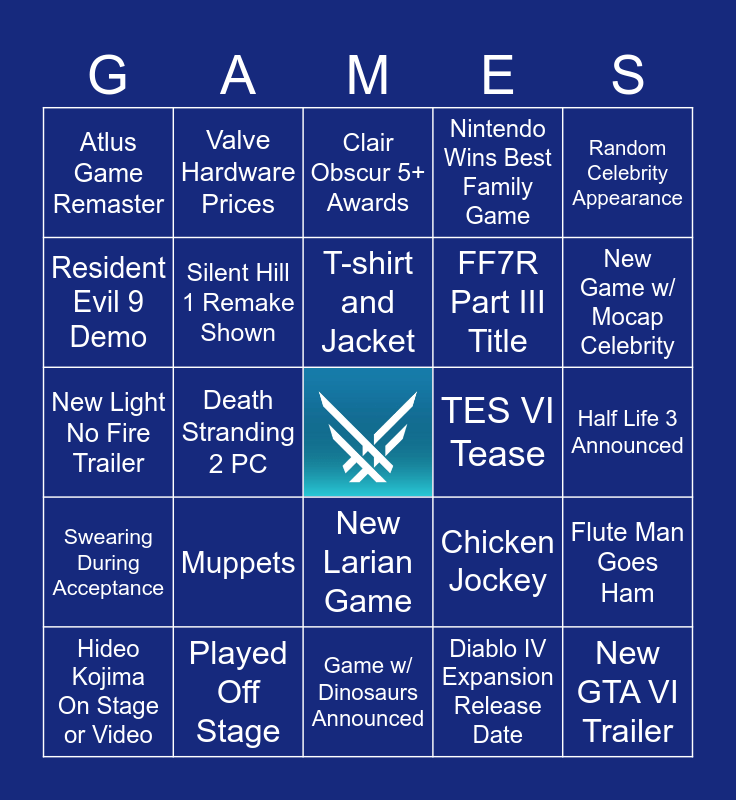 This bingo card has a free space and 24 words: Muppets, Played Off Stage, T-shirt and Jacket, Hideo Kojima On Stage or Video, Random Celebrity Appearance, Atlus Game Remaster, Resident Evil 9 Demo, Valve Hardware Prices, TES VI Tease, New Larian Game, FF7R Part III Title, New Light No Fire Trailer, Chicken Jockey, Flute Man Goes Ham, Silent Hill 1 Remake Shown, Diablo IV Expansion Release Date, Half Life 3 Announced, Clair Obscur 5+ Awards, New Game w/ Mocap Celebrity, Death Stranding 2 PC, New GTA VI Trailer, Swearing During Acceptance, Nintendo Wins Best Family Game and Game w/ Dinosaurs Announced.
