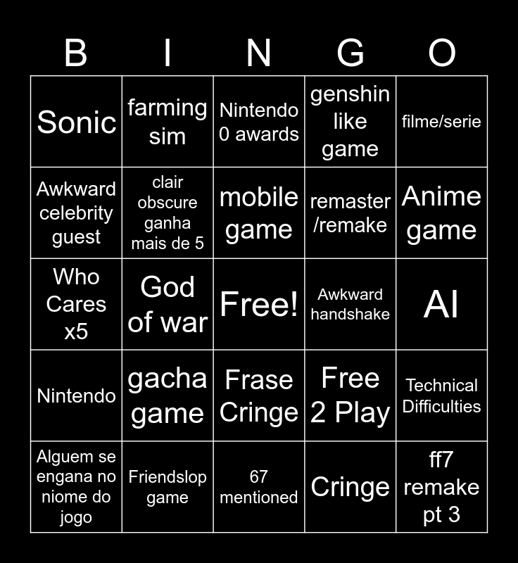 This bingo card has a free space and 39 words: Same date release, Atlus!, Kojima, clair obscure ganha mais de 5, Alguem se engana no niome do jogo, Frase Cringe, mobile game, Genshin impact vence, filme/serie, Nintendo, God of war, genshin like game, ff7 remake pt 3, AI, Awkward handshake, gacha game, silksong dlc, Sonic, Half life 3, Free 2 Play, Awkward celebrity guest, 67 mentioned, remaster /remake, Anime game, Minecraft 2, Free on gamepass, Indie Game, "Hurry up", Swear word, farming sim, Zelda Movie, Marvel Game, Nintendo 0 awards, Friendslop game, Cringe, Umamusume Wins, Technical Difficulties, Who Cares x5 and Something Simulator.