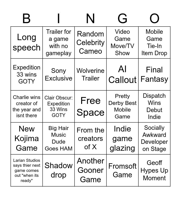 This bingo card has a free space and 24 words: Big Hair Music Dude Goes HAM, Shadow drop, Wolverine Trailer, Larian Studios says thier next game comes out "when its ready", Mobile Game Tie-In Item Drop, Long speech, Expedition 33 wins GOTY, Trailer for a game with no gameplay, Pretty Derby Best Mobile Game, From the creators of X, AI Callout, Charlie wins creator of the year and isnt there, Indie game glazing, Socially Awkward Developer on Stage, Sony Exclusive, Fromsoft Game, Dispatch Wins Debut Indie, Random Celebrity Cameo, Final Fantasy, Clair Obscur: Expedition 33 Wins GOTY, Geoff Hypes Up Moment, New Kojima Game, Video Game Move/TV Show and Another Gooner Game.