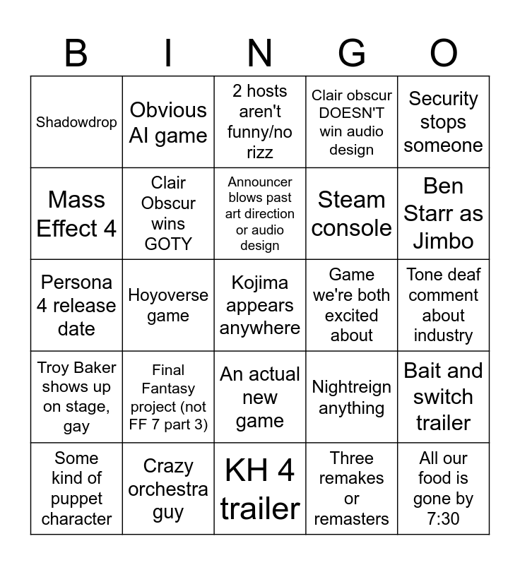This bingo card has a free space and 24 words: Final Fantasy project (not FF 7 part 3), Crazy orchestra guy, Announcer blows past art direction or audio design, Some kind of puppet character, Security stops someone, Shadowdrop, Mass Effect 4, Obvious AI game, Game we're both excited about, An actual new game, Steam console, Persona 4 release date, Nightreign anything, Bait and switch trailer, Clair Obscur wins GOTY, Three remakes or remasters, Tone deaf comment about industry, 2 hosts aren't funny/no rizz, Ben Starr as Jimbo, Hoyoverse game, All our food is gone by 7:30, Troy Baker shows up on stage, gay, Clair obscur DOESN'T win audio design and KH 4 trailer.
