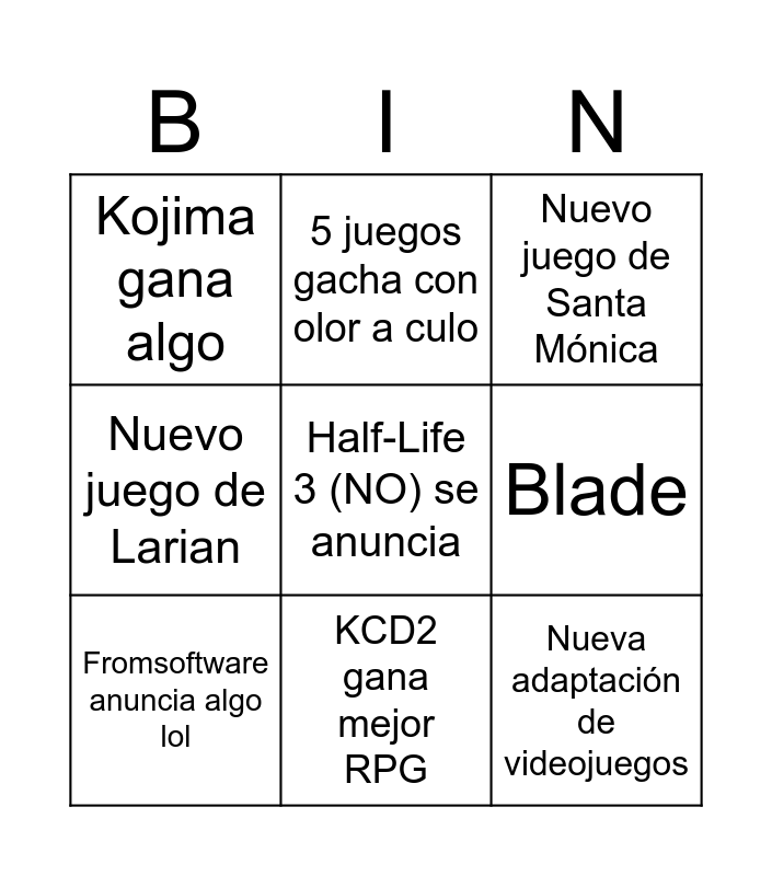 This bingo card has a free space and 8 words: Blade, Nuevo juego de Santa Mónica, 5 juegos gacha con olor a culo, Fromsoftware anuncia algo lol, Kojima gana algo, Nueva adaptación de videojuegos, Nuevo juego de Larian and KCD2 gana mejor RPG.
