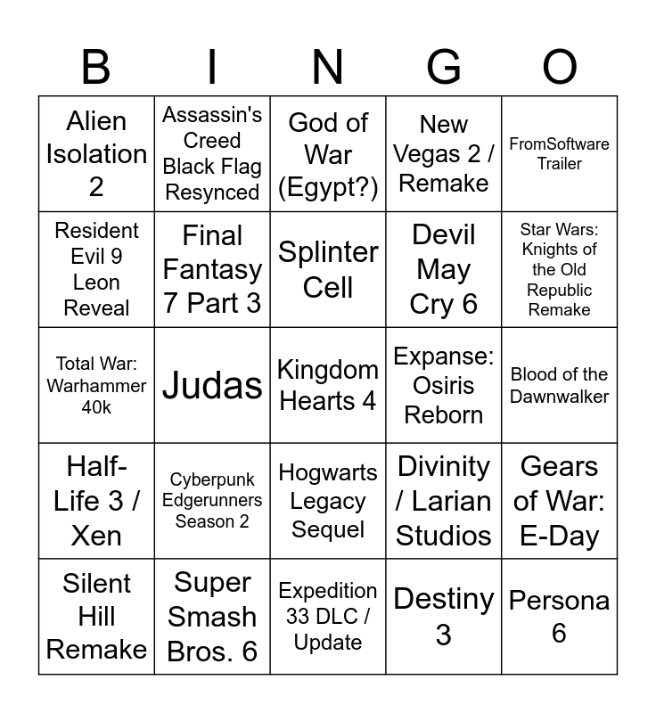 This bingo card has 25 words: Cyberpunk Edgerunners Season 2, Expedition 33 DLC / Update, Splinter Cell, Silent Hill Remake, FromSoftware Trailer, Alien Isolation 2, Resident Evil 9 Leon Reveal, Assassin's Creed Black Flag Resynced, Expanse: Osiris Reborn, Hogwarts Legacy Sequel, Devil May Cry 6, Total War: Warhammer 40k, Divinity / Larian Studios, Gears of War: E-Day, Final Fantasy 7 Part 3, Persona 6, Blood of the Dawnwalker, God of War (Egypt?), Star Wars: Knights of the Old Republic Remake, Judas, Kingdom Hearts 4, Super Smash Bros. 6, Half-Life 3 / Xen, New Vegas 2 / Remake and Destiny 3.