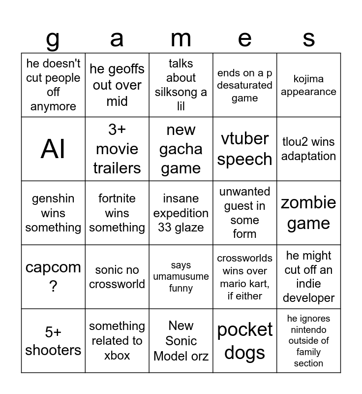 This bingo card has a free space and 24 words: sonic no crossworld, something related to xbox, new gacha game, 5+ shooters, kojima appearance, he doesn't cut people off anymore, AI, he geoffs out over mid, unwanted guest in some form, says umamusume funny, vtuber speech, genshin wins something, crossworlds wins over mario kart, if either, he might cut off an indie developer, 3+ movie trailers, pocket dogs, zombie game, talks about silksong a lil, tlou2 wins adaptation, fortnite wins something, he ignores nintendo outside of family section, capcom ?, ends on a p desaturated game and New Sonic Model orz.