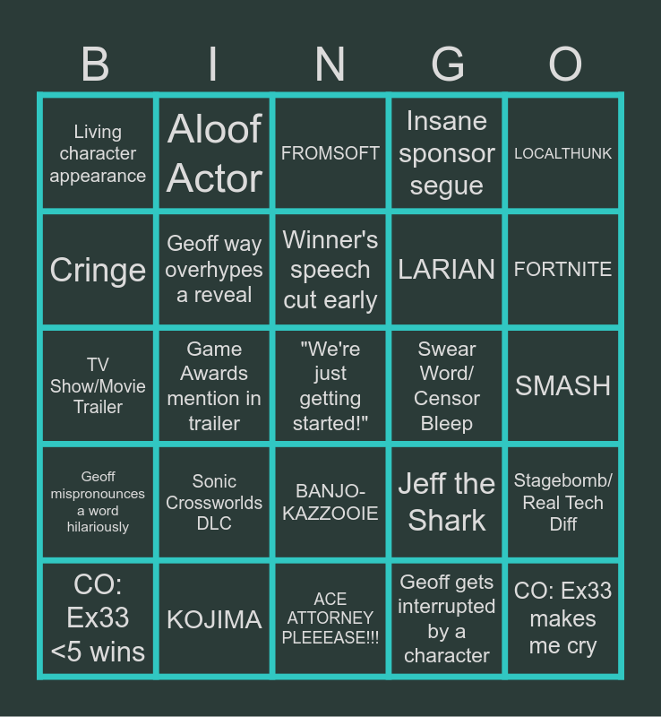 This bingo card has a free space and 24 words: CO: Ex33 <5 wins, Sonic Crossworlds DLC, Winner's speech cut early, Geoff gets interrupted by a character, LOCALTHUNK, Living character appearance, Aloof Actor, FROMSOFT, Swear Word/ Censor Bleep, SMASH, TV Show/Movie Trailer, Geoff way overhypes a reveal, Jeff the Shark, Stagebomb/ Real Tech Diff, Cringe, KOJIMA, ACE ATTORNEY PLEEEASE!!!, Insane sponsor segue, FORTNITE, Geoff mispronounces a word hilariously, Game Awards mention in trailer, BANJO- KAZZOOIE, LARIAN and CO: Ex33 makes me cry.