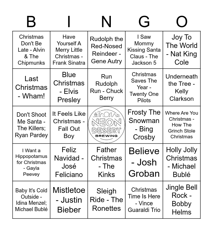 This bingo card has a free space and 51 words: All I Want for Christmas Is You - Mariah Carey, Jingle Bell Rock - Bobby Helms, Rockin' Around The Christmas Tree - Brenda Lee, Sleigh Ride - The Ronettes, Feliz Navidad - José Feliciano, My Only Wish (This Year) - Britney Spears, Have Yourself A Merry Little Christmas - Frank Sinatra, Little Saint Nick - The Beach Boys, Last Christmas - Wham!, Deck The Hall - Nat King Cole, Blue Christmas - Elvis Presley, I Saw Mommy Kissing Santa Claus - The Jackson 5, Holly Jolly Christmas - Michael Bublé, Believe - Josh Groban, Do You Hear What I Hear? - Bing Crosby, Do They Know It's Christmas? - Band Aid, Run Rudolph Run - Chuck Berry, Frosty The Snowman - Bing Crosby, Last Christmas - Ariana Grande, Joy To The World - Nat King Cole, It Feels Like Christmas - Fall Out Boy, Christmas Time Is Here - Vince Guaraldi Trio, Christmas Don't Be Late - Alvin & The Chipmunks, Christmas Saves The Year - Twenty One Pilots, Carol of the Bells - John Williams, What's This? - Danny Elfman, Underneath the Tree - Kelly Clarkson, Do You Want to Build a Snowman? - Frozen, Baby It's Cold Outside - Idina Menzel; Michael Bublé, Rudolph the Red-Nosed Reindeer - Gene Autry, Christmas Shoes - John McNicholl, Thank God It's Christmas - Queen, Happy Xmas (War Is Over) - John Lennon; Yoko Ono, Mistletoe And Holly - Frank Sinatra, I Wish It Was Christmas Today - Basketball Team, Mistletoe - Justin Bieber, Rudolph The Red-Nosed Reindeer - Burl Ives, Santa Claus Is Coming to Town - Daniel & The Holly Jollies, Here Comes Santa Claus - Elvis Presley, All I Want For Christmas Is My Two Front Teeth - Alvin & The Chipmunks, Where Are You Christmas - How The Grinch Stole Christmas, I Want a Hippopotamus for Christmas - Gayla Peevey, I'll Be Home for Christmas - Michael Bublé, 'Zat You, Santa Claus? - Louis Armstrong; The Commanders, You're A Mean One Mr Grinch - How the Grinch Stole Christmas!, Merry Christmas - Ed Sheeran; Elton John, Don't Shoot Me Santa - The Killers; Ryan Pardey, Grandma Got Run over by a Reindeer - Elmo & Patsy, The Night Santa Went Crazy - "Weird Al" Yankovic, Father Christmas - The Kinks and The First Noel - Frank Sinatra.
