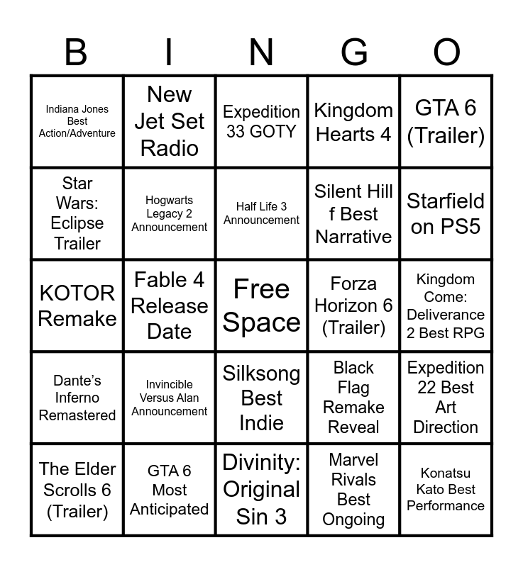 This bingo card has a free space and 24 words: The Elder Scrolls 6 (Trailer), Invincible Versus Alan Announcement, Half Life 3 Announcement, Marvel Rivals Best Ongoing, GTA 6 (Trailer), Indiana Jones Best Action/Adventure, New Jet Set Radio, Expedition 33 GOTY, Forza Horizon 6 (Trailer), Kingdom Come: Deliverance 2 Best RPG, KOTOR Remake, Hogwarts Legacy 2 Announcement, Black Flag Remake Reveal, Expedition 22 Best Art Direction, Star Wars: Eclipse Trailer, GTA 6 Most Anticipated, Divinity: Original Sin 3, Kingdom Hearts 4, Starfield on PS5, Dante’s Inferno Remastered, Fable 4 Release Date, Silksong Best Indie, Silent Hill f Best Narrative and Konatsu Kato Best Performance.