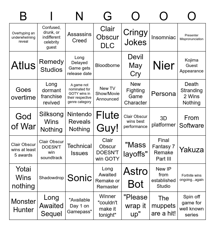 This bingo card has a free space and 48 words: Astro Bot, Nier, Winner "couldn't make it tonight", Silksong Wins Nothing, A game not nominated for GOTY wins in their respective genre category, From Software, Confused, drunk, or indifferent celebrity guest, Long Awaited Sequel, Insomniac, Clair Obscur DOESN'T win GOTY, Presenter Mispronunciation, Clair Obscur DLC, Persona, New Fighting Game Character, Yotai Wins nothing, 3D platformer, Atlus, Kojima Guest Appearance, New IP from established Studio, Cringy Jokes, Devil May Cry, Nintendo Reveals Nothing, Overhyping an underwhelming reveal, Remedy Studios, Fortnite wins ongoing...again, Long Delayed Game gets release date, Death Stranding 2 Wins Nothing, Monster Hunter, New TV Show/Movie Announced, Long dormant franchise revived, The muppets are a hit!, Clair Obscur wins best performance, Yakuza, Shadowdrop, God of War, "Mass layoffs", Final Fantasy 7 Remake Part III, Goes overtime, Technical Issues, Sonic, Clair Obscur wins at least 5 awards, Spin off game for well known series, Assassins Creed, "Available Day 1 on Gamepass", Bloodborne, Long Awaited Remake or Remaster, Clair Obscur DOESN'T win soundtrack and "Please wrap it up".