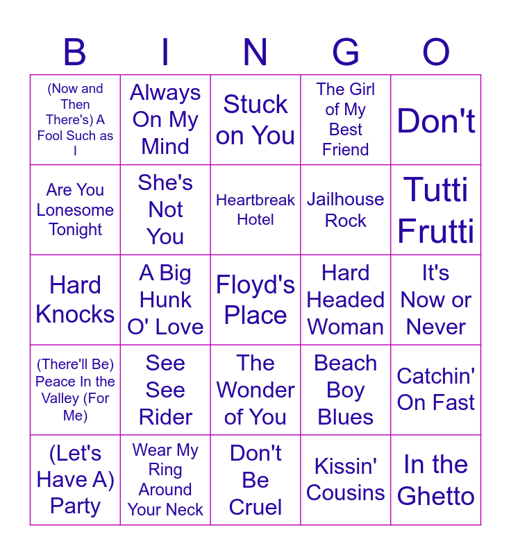 This bingo card has a free space and 74 words: That's All Right, Mystery Train, Heartbreak Hotel, Blue Suede Shoes, Lawdy, Miss Clawdy, Hound Dog, Love Me Tender, Too Much, All Shook Up, (Let Me Be Your) Teddy Bear, (Let's Have A) Party, Loving You, Jailhouse Rock, Don't, Trouble, Wear My Ring Around Your Neck, King Creole, Hard Headed Woman, One Night, (Now and Then There's) A Fool Such as I, A Big Hunk O' Love, Stuck on You, The Girl of My Best Friend, It's Now or Never, Are You Lonesome Tonight, Wooden Heart, Surrender, (Marie's the Name) His Latest Flame, Can't Help Falling in Love, Good Luck Charm, She's Not You, Return To Sender, (You're The) Devil In Disguise, Viva Las Vegas, Crying In the Chapel, Love Letters, Guitar Man, If I Can Dream, In the Ghetto, Suspicious Minds, Don't Cry Daddy, The Wonder of You, I Just Can't Help Believin', An American Trilogy, Burning Love, Always On My Mind, Suspicion, Moody Blues, Way Down, Blue Christmas, Anyplace Is Paradise, Moonlight Swim, Beach Boy Blues, Kentucky Rain, Shake, Rattle and Roll, Just Because, Don't Be Cruel, Mean Woman Blues, I Need You So, (There'll Be) Peace In the Valley (For Me), See See Rider, Big Boss Man, Kissin' Cousins, Catchin' On Fast, Hard Knocks, Girls! Girls! Girls!, Shoppin' Around, Dixieland Rock, Tutti Frutti, Money Honey, Long Tall Sally, Rip It Up, Love Me and Ready Teddy.